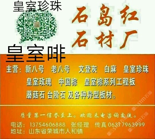 該企業(yè)尚未填寫(xiě)簡(jiǎn)介,請(qǐng)補(bǔ)充!山東石島紅石材廠主營(yíng) 新八號(hào) 老八號(hào) 文登灰 白麻 皇室珍珠 皇室玫瑰 中國(guó)棕 皇室宗系列工程板 蘑菇石 臺(tái)階石 及各種異型板材。質(zhì)量信譽(yù)至上。歡迎來(lái)電咨詢交流。電話 13754606888 張經(jīng)理 傳真 0631 7963999。 qq 245382641
