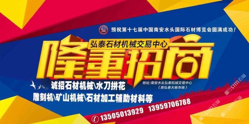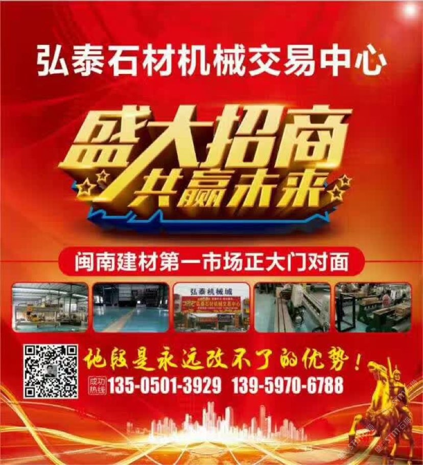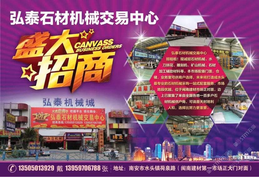 弘泰石材機(jī)械交易中心招租啦!現(xiàn)誠(chéng)招石材機(jī)械、水刀拼花、雕刻機(jī)、礦山機(jī)械、石材加工輔助材料等。本市場(chǎng)配備門(mén)面,倉(cāng)儲(chǔ),業(yè)務(wù)室可供商戶選擇,未來(lái)將打造成水頭專(zhuān)業(yè)的石材機(jī)械采購(gòu)一站式配套服務(wù),市場(chǎng)地段優(yōu)越,位于閩南建材市場(chǎng)正對(duì)面,邊上已聚集了來(lái)自全國(guó)各地一百多戶石材機(jī)械供戶商,可說(shuō)是天時(shí)地利人和,選擇比努力更重要。