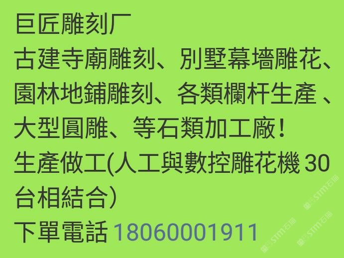 5年專業(yè)石業(yè)雕刻加工,寺廟古建、幕墻建材、園林欄桿,等石材雕刻類加工。歡迎洽談合作!有意直接電話!微聊長(zhǎng)時(shí)間沒(méi)登
