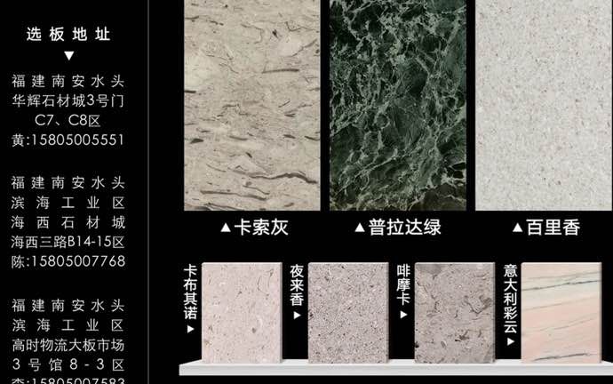 自有礦山——黃金桂。意大利:百里香,啡摩卡,夜來香,廣安灰,新廣安灰,普拉達(dá)綠,魔力點(diǎn)子,彩云,卡索灰,蝴蝶灰。