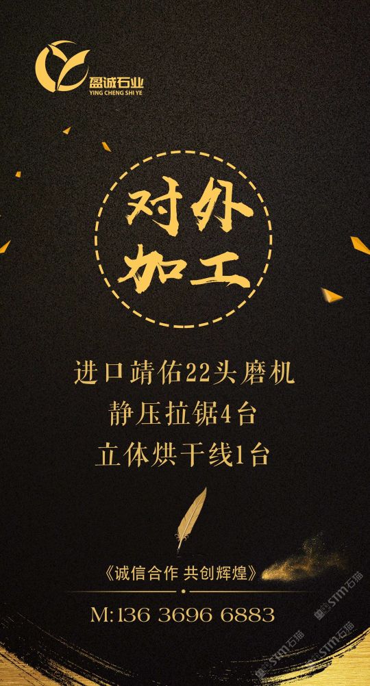 加工廠內設進口靖佑22頭磨機,靜壓拉鋸4臺,立體烘干線1臺。5臺快鋸、16頭自動磨、3臺中切機、雙層補板線及烘干線、紅外線橋切、倒角磨邊機械、大型工程深加工,集設計、銷售,加工一體化流水式作業(yè)。承接外墻干掛、園林鋪地、異形加工、條板批發(fā)及出口訂單。本公司一直堅持從礦山源頭把關,為客戶爭取更大的品質與優(yōu)勢