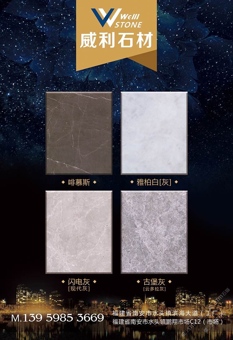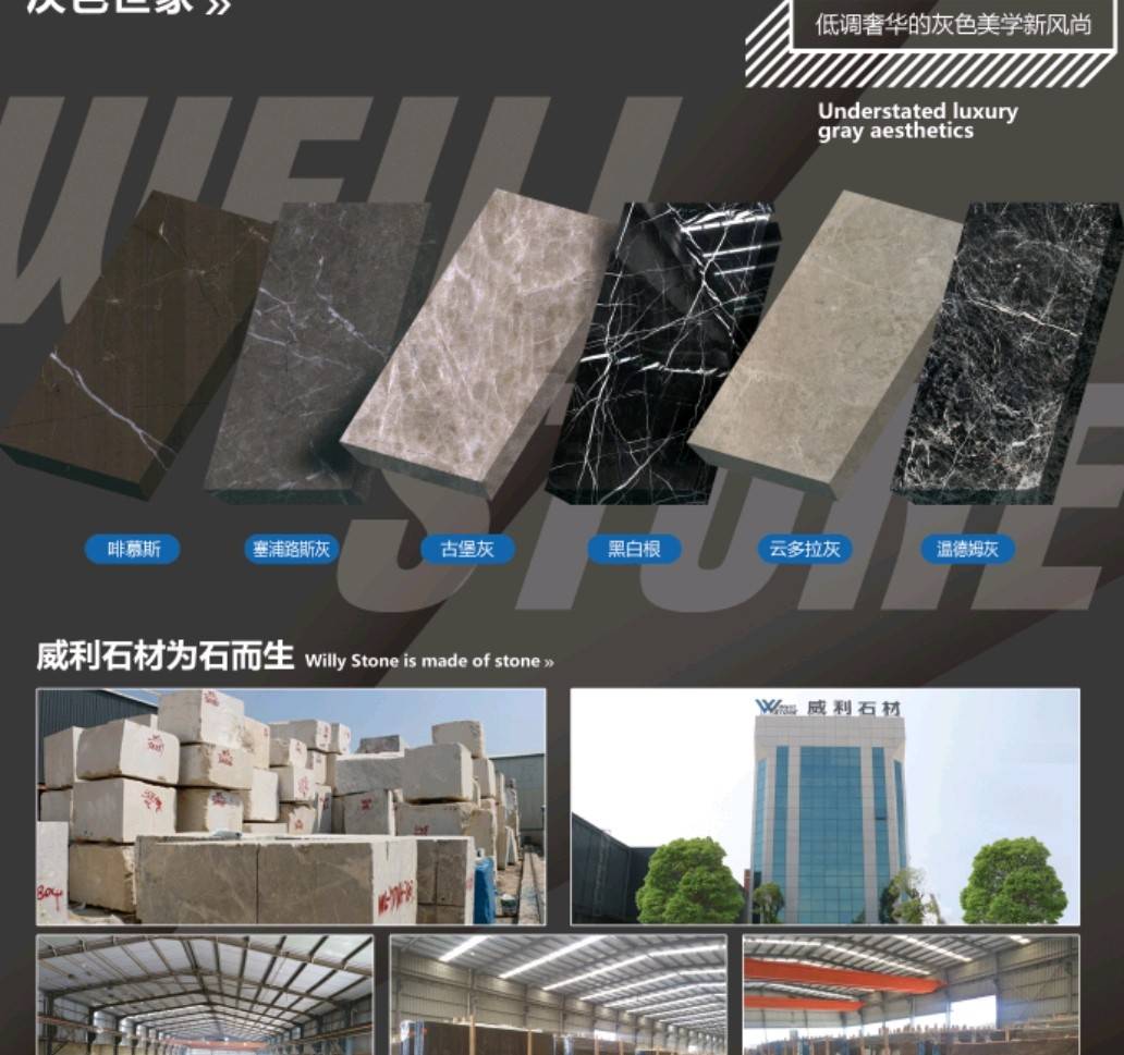 南安市威利石材有限公司成立于2008年,是一家集礦山開采、加工、銷售、工程設計施工、進出口貿(mào)易為一體的綜合型企業(yè)。我們不僅提供石材,更為您精心設計全套優(yōu)質(zhì)的石材解決方案。 威利石材專注于石材產(chǎn)品的礦山荒料直銷、大板加工、大板展銷、工程設計、工程配套施工服務 。公司主營啡慕斯、黑白根、塞浦路斯灰、古堡灰,愛馬仕灰(溫德姆灰),雅柏白,閃電灰多種優(yōu) 質(zhì)品種。公司已成為一家集專業(yè)化、產(chǎn)業(yè)化和規(guī)模化的工程材料采購、加工配套服務商。 威利石材以自己多年專業(yè)化和國際化的經(jīng)營,與國內(nèi)外礦山建立了良好的商業(yè)信譽和經(jīng)貿(mào)合作關 系,贏得了國外礦山在中國區(qū)營銷戰(zhàn)略的全力支持。 威利石材依靠豐富的礦山資源,先進的管理、施工經(jīng)驗,堅持“以市場為導向、以技術為主體、 以質(zhì)量為命脈、以效益為中心”,大膽探索,在技術進步、生產(chǎn)經(jīng)營、企業(yè)管理、產(chǎn)品質(zhì)量、售后服務等 方面始終走在行業(yè)的前列。并在信守“質(zhì)量為準、信譽優(yōu)等、服務為上”的企業(yè)精神指導下,產(chǎn)品暢銷世 界各地,深得消費者的信賴和贊譽。我們時刻把握時代脈搏,走在市場前沿,揮灑石材文化,增添人類輝煌。多年來我們一直致力于服務質(zhì)量的提高?!邦櫩蜑樯稀?、“追求圓滿”已經(jīng)融入到公司的企業(yè)文化、經(jīng)營 理念當中,并且在產(chǎn)品生產(chǎn)、過程服務、售后追蹤等具體工作中得到落實。 我們的追求——集世界美石,為中國添彩!\