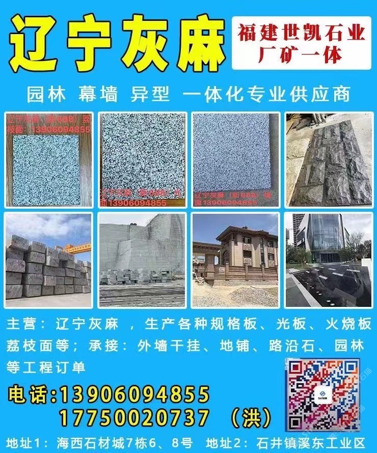 主營石種:遼寧灰麻(新688) 、 芝麻黑(新G654) ,長期儲存5000~10000立方荒料,滿足各大石材工程需求。從荒料開采到成品呈現(xiàn),產(chǎn)品涉及園林、幕墻、異型等各類工程訂單,廠礦一體,公司下設(shè)荒料堆場部,市場營銷部,工廠配備專業(yè)生產(chǎn)先進(jìn)機(jī)械設(shè)備。25年來專注于各種天然石材加工、成品、銷售?,F(xiàn)已成為專業(yè)國內(nèi)外石材供應(yīng)商,本著“誠信為本,合作共贏”經(jīng)營理念,為廣大客戶提供生產(chǎn)配套以及大型施工安裝一條龍服務(wù)!