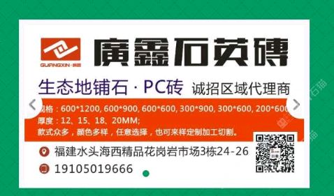 廣鑫石英磚/PC磚 聯(lián)系人:劉    134****2000 查看 手機(jī)號(hào)碼:無 主營(yíng)范圍: 花崗巖加工、石材外貿(mào)、更多、環(huán)境石材、大理石加工、 企業(yè)地址:福建泉州福建省泉州市南安市水頭鎮(zhèn)海西石材城海五路1-81\\n