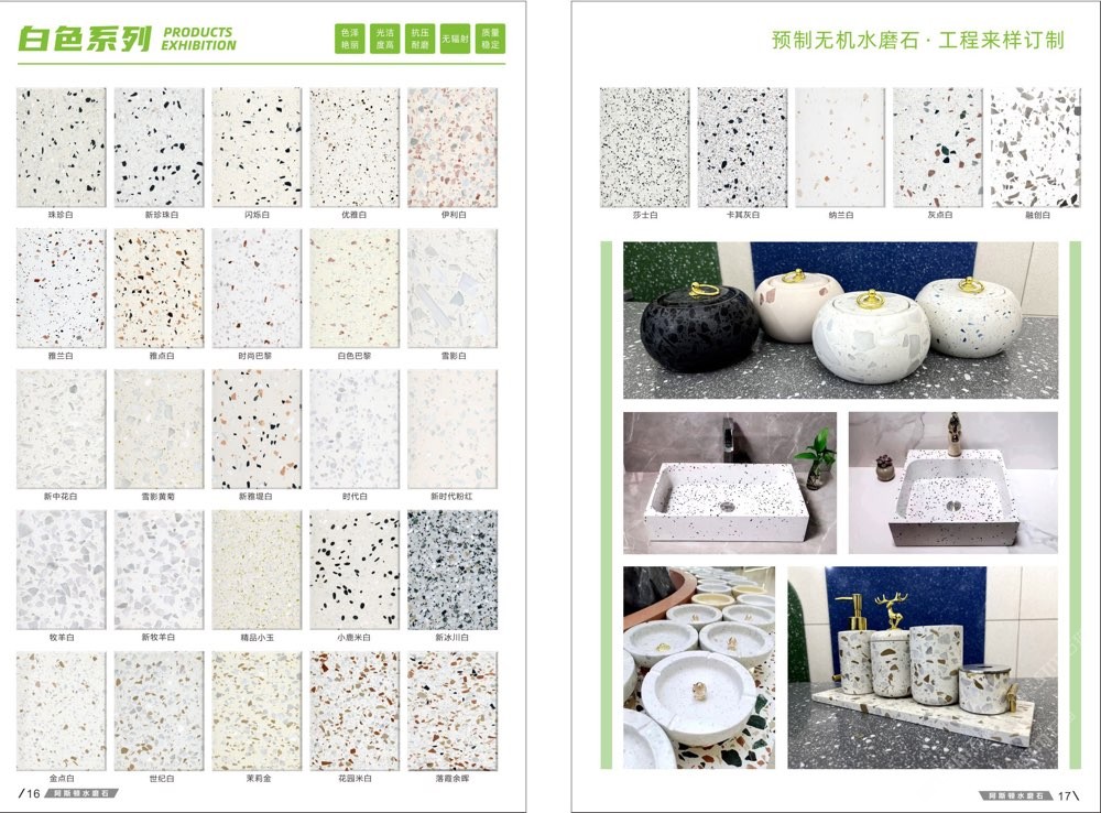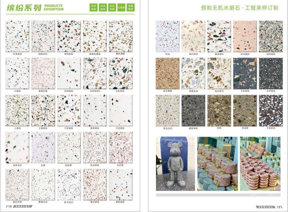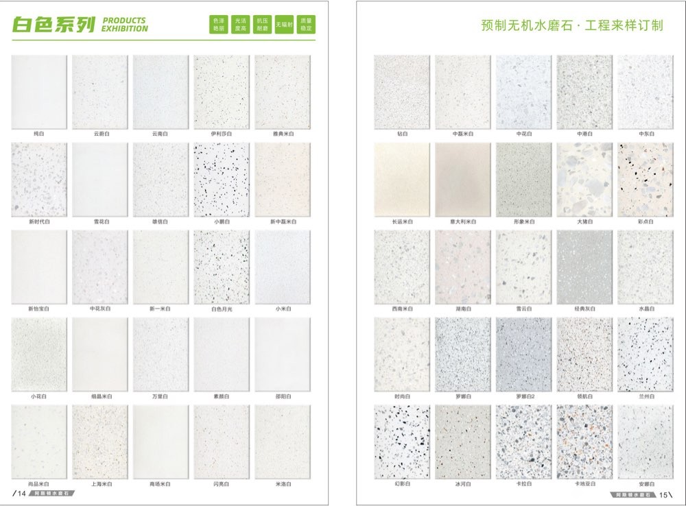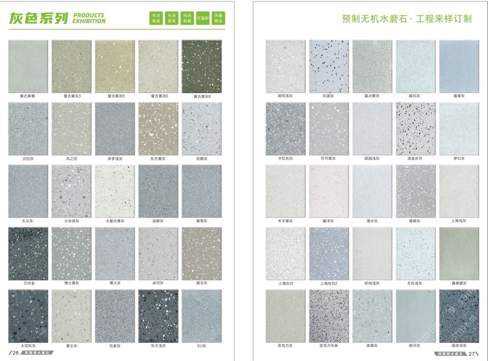 發(fā)布信息: #阿斯頓水磨石 新版畫冊預告,喜歡嗎 純無機水磨石,專業(yè),品質保證! ① 無樹脂、天然花色 ② 可定制任意款式(設計/尺寸) ③ 來板仿樣2~3天完成 ④ 生產、銷售、加工一體化