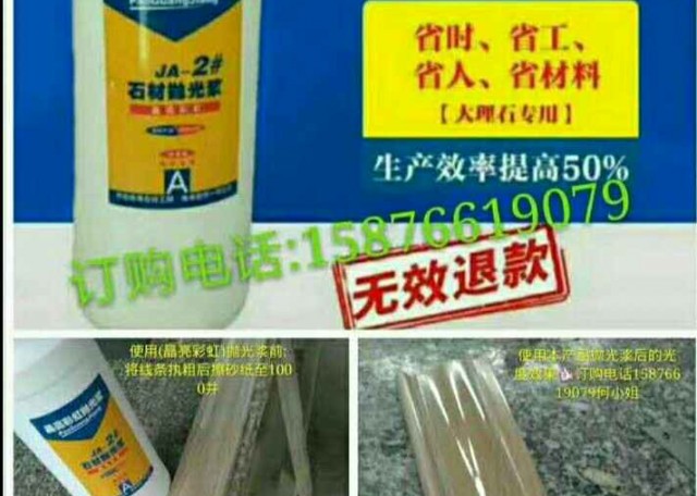 發(fā)布信息: 現(xiàn)場工地上處理縫口、墻身、地面、線條等異形工藝品光度。大理石只需擦砂紙到320#目去凈砂路,然后使用本產(chǎn)品即(拋光漿十手十布)用力與板材摩擦約1~2分鐘后即可擦出油亮光度,全真光不打蠟!詳情熱線:15876619079何小姐