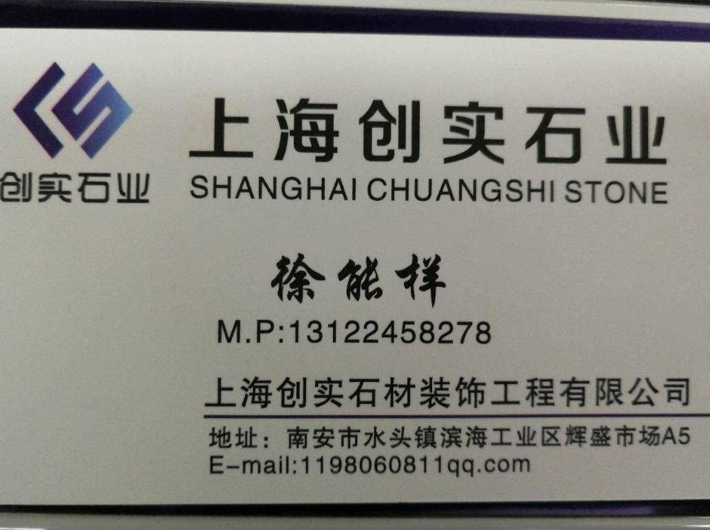 上海創(chuàng)實(shí)石業(yè) 聯(lián)系人:徐    131****8278 查看 手機(jī)號(hào)碼:無(wú) 主營(yíng)范圍: 大板批發(fā)、荒料、 企業(yè)地址:福建泉州南安市水頭鎮(zhèn)輝盛大板市場(chǎng)