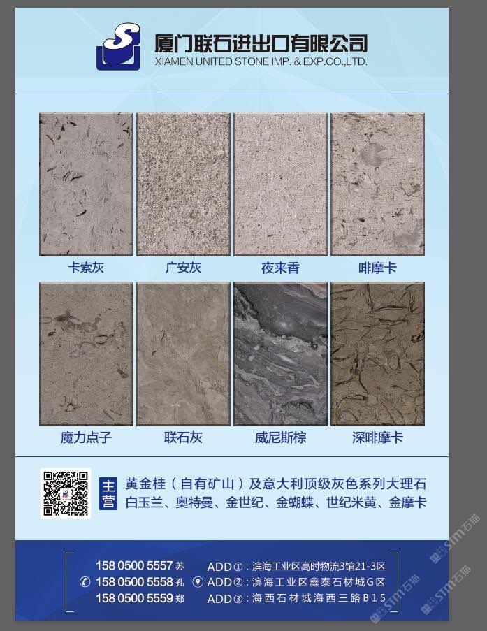 廈門聯(lián)石進出口有限公司 聯(lián)系人:鄭俊彬    158****5559 查看 手機號碼:無 主營范圍: 礦山、荒料、大板批發(fā)、石材外貿(mào)、 企業(yè)地址:福建泉州水頭鎮(zhèn)濱海工業(yè)區(qū)高時3館8倉3區(qū)