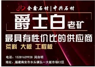 君陽·上景石業(yè)主營產(chǎn)品:雅士白,雅士白1,雅士白(希臘礦),雅士白(新礦),雅士白(希臘),爵士白,爵士白2,爵士白(老礦),爵士白(大礦),新爵士白企業(yè)地址:福建泉州南安市萬典石材城1號(hào)門走到底(君陽-上景石業(yè))